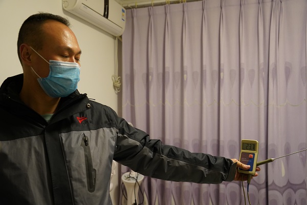 在20號(hào)樓3單元6樓的住戶家中,劉婷用手摸了摸用戶家的地板磚,通過人體的直觀感受,發(fā)現(xiàn)用戶家地暖存在散熱不均勻的現(xiàn)象??头芗矣脤I(yè)的測(cè)溫儀和熱成像儀,進(jìn)行了測(cè)溫。經(jīng)檢測(cè),該用戶家各房間平均溫度均在23℃以上。用戶說,家中較冷的房間是廚房,客服管家又針對(duì)廚房進(jìn)行了測(cè)溫,發(fā)現(xiàn)室溫要比其他房間溫度低一些,但熱成像儀測(cè)得的結(jié)果與其他房間一致。經(jīng)過觀察與分析,發(fā)現(xiàn)用戶家廚房與陽臺(tái)間的隔斷是一扇落地大玻璃門,保溫效果較差,導(dǎo)致廚房溫度低于其他房間。聽了工作人員的講解,用戶也表示了認(rèn)可,對(duì)我們的排查結(jié)果及服務(wù)態(tài)度表示滿意。