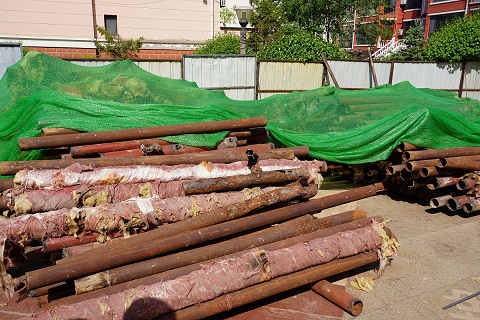 5月17日,筆者來(lái)到開天花園小區(qū)的供熱二次管網(wǎng)改造施工現(xiàn)場(chǎng)。在高層單元樓的管道井里,工人正在狹窄的空間里作業(yè),將單元樓道內(nèi)的立管進(jìn)行切割拆除。在施工材料現(xiàn)場(chǎng),西北角堆滿了拆除下來(lái)的地溝管,部分管道腐蝕嚴(yán)重,布滿了密密麻麻的窟窿眼兒;東北角堆放了新到的管材,工人們正在進(jìn)行單元立管外表的打磨工作,打磨完成后再進(jìn)行粉刷兩遍防腐漆。