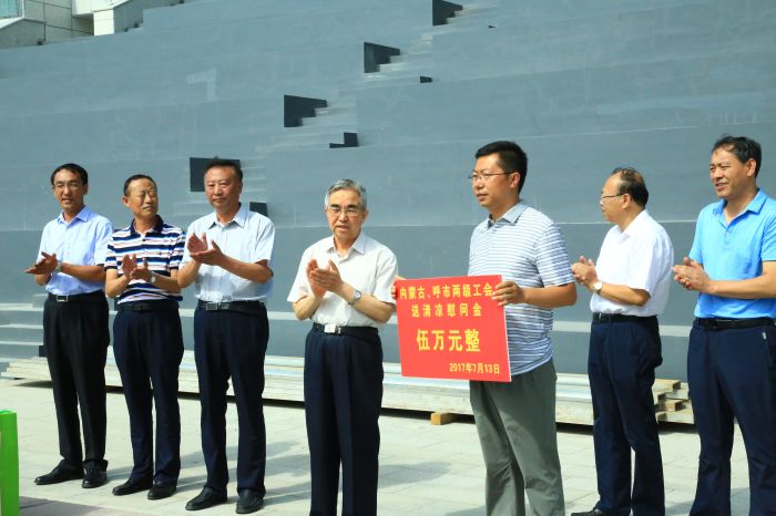 7月13日,內(nèi)蒙古自治區(qū)人大常委會(huì)副主任、總工會(huì)主席杭桂林,呼和浩特市政府副巡視員、黨組成員劉敏,市人大常委會(huì)副主任、總工會(huì)主席斯欽畢力格等一行向奮戰(zhàn)在我市重大項(xiàng)目重點(diǎn)工程內(nèi)蒙古少數(shù)民族群眾文化體育運(yùn)動(dòng)中心一線施工現(xiàn)場(chǎng)的工作人員進(jìn)行送清涼慰問(wèn),發(fā)放5萬(wàn)元慰問(wèn)金,表達(dá)了兩級(jí)政府對(duì)我市重大項(xiàng)目重點(diǎn)工程一線單位職工的深切問(wèn)候和關(guān)懷。城發(fā)公司董事長(zhǎng)、黨委書(shū)記張瑞平,黨委副書(shū)記、工會(huì)主席張永等領(lǐng)導(dǎo)陪同。文\陳柯羽