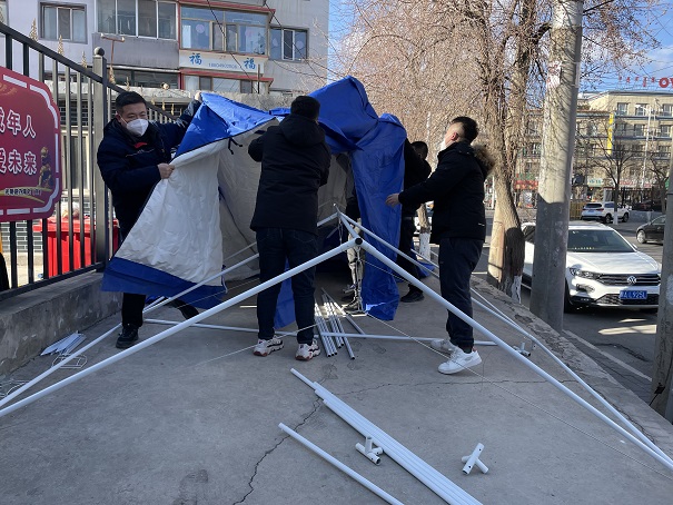 連日來,公司的近百名員工陸續(xù)被派往社區(qū)一線支援疫情防控工作,事務(wù)管理中心安排專人和他們保持聯(lián)系,及時把一次性醫(yī)用外科口罩、N95口罩、防護服、防護手套、隔離面罩等疫情防控物資送到各個值守點。2月28日,事務(wù)管理中心主任胡夢園、黨支部書記劉紅梅在電子路社區(qū)值守點查看時,發(fā)現(xiàn)當班的員工在寒風中堅守著,及時為他們搭建了帳篷,送來了電暖氣。