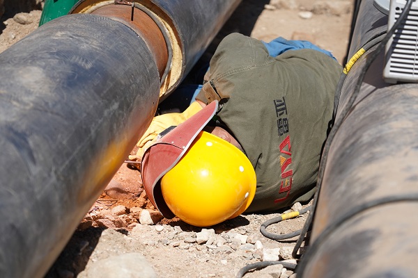筆者帶好安全帽,也順著工人們下溝的唯一路徑----一個近乎垂直立在溝邊梯子下到溝里,每走一步,周圍的土就在"簌簌"的往下掉,筆者的心也跟著這些土渣心驚膽戰(zhàn)。來到管道溝里,兩根粗粗的管子并排向遠方延伸去。管溝雖然深,但是并不寬,作業(yè)空間不大。